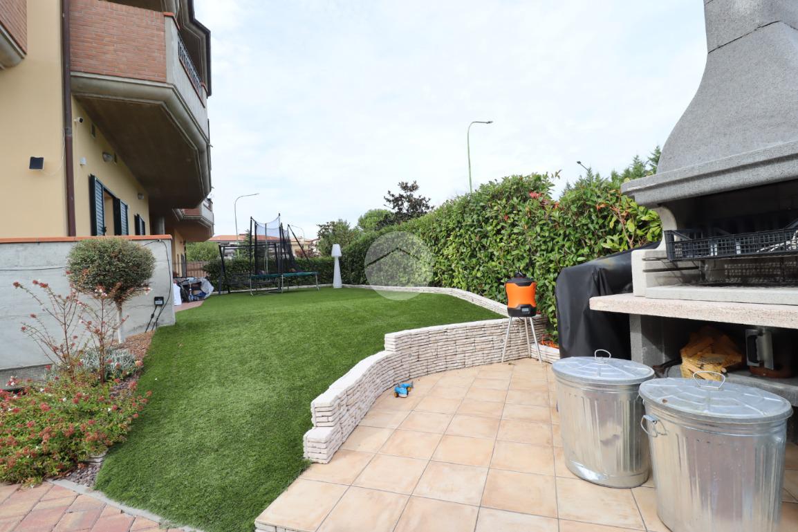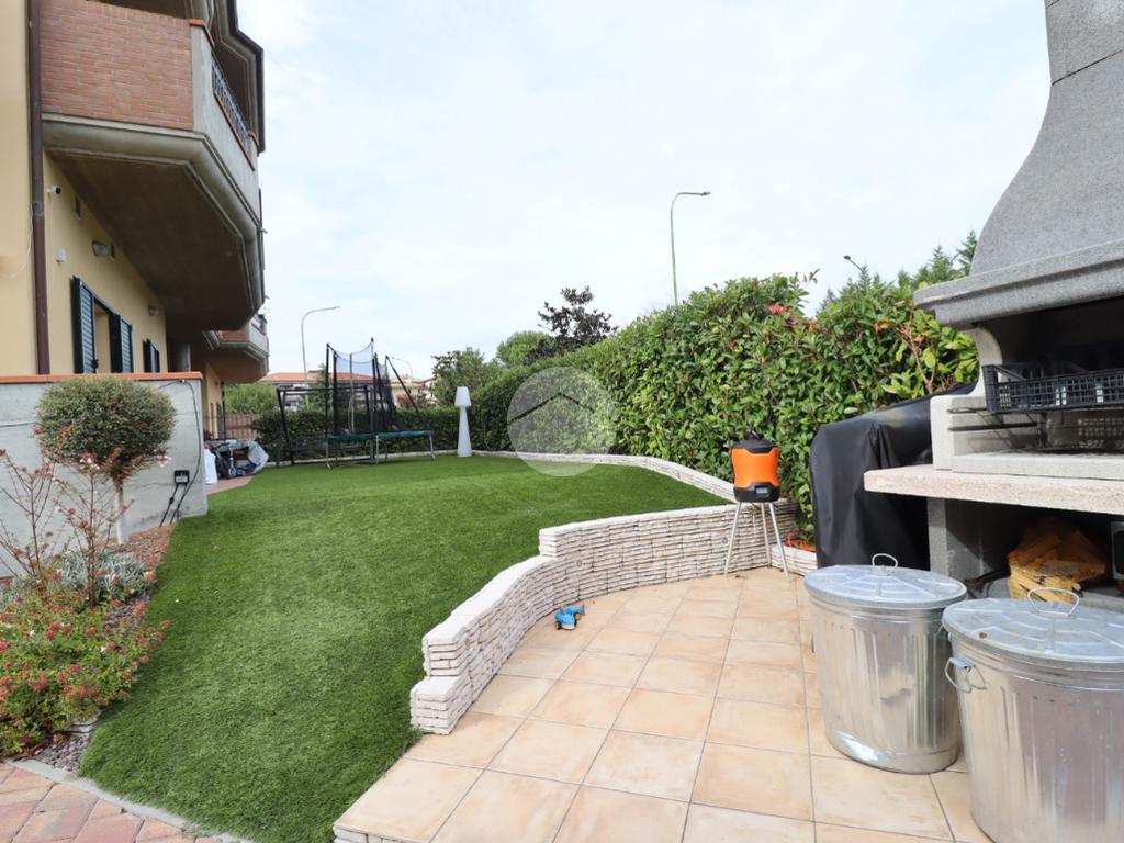 A completamento dell’area, troviamo una zona barbecue attrezzata, perfetta per pranzi e cene all'aperto, un impianto di illuminazione a faretti che valorizza lo spazio nelle ore serali, e un grande vaso scenografico con pianta ornamentale, elemento decorativo di forte impatto visivo.