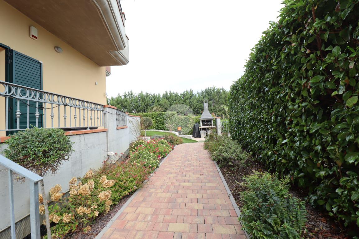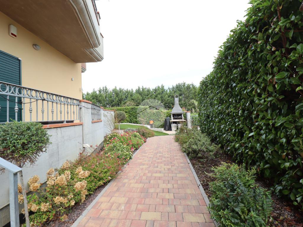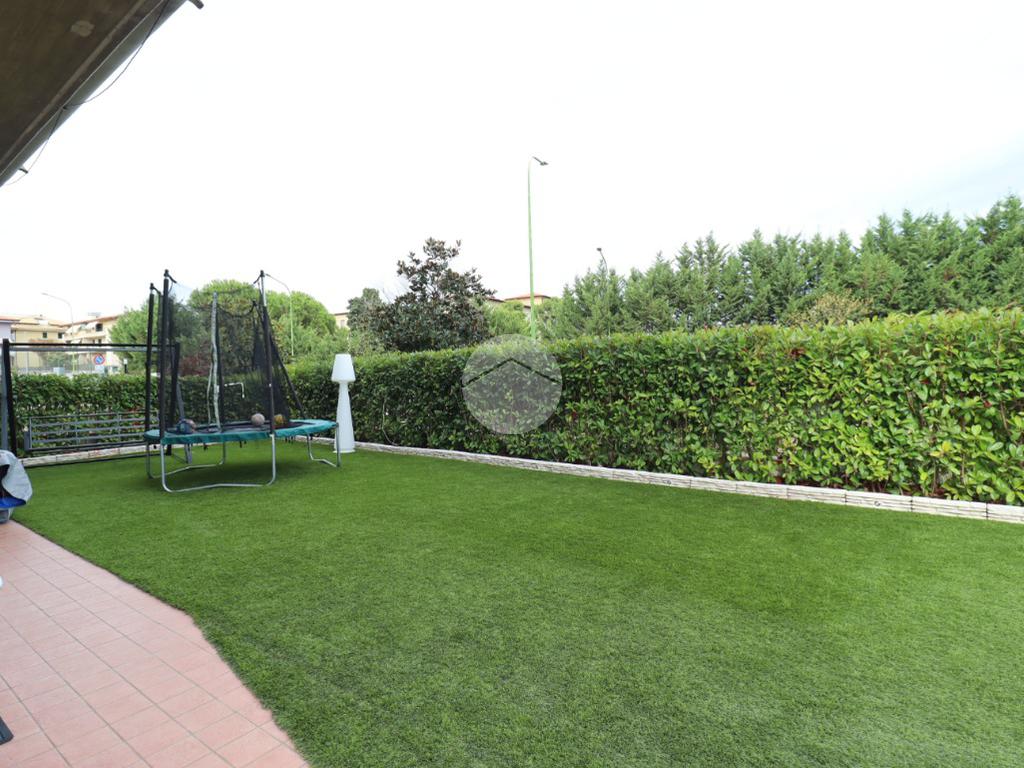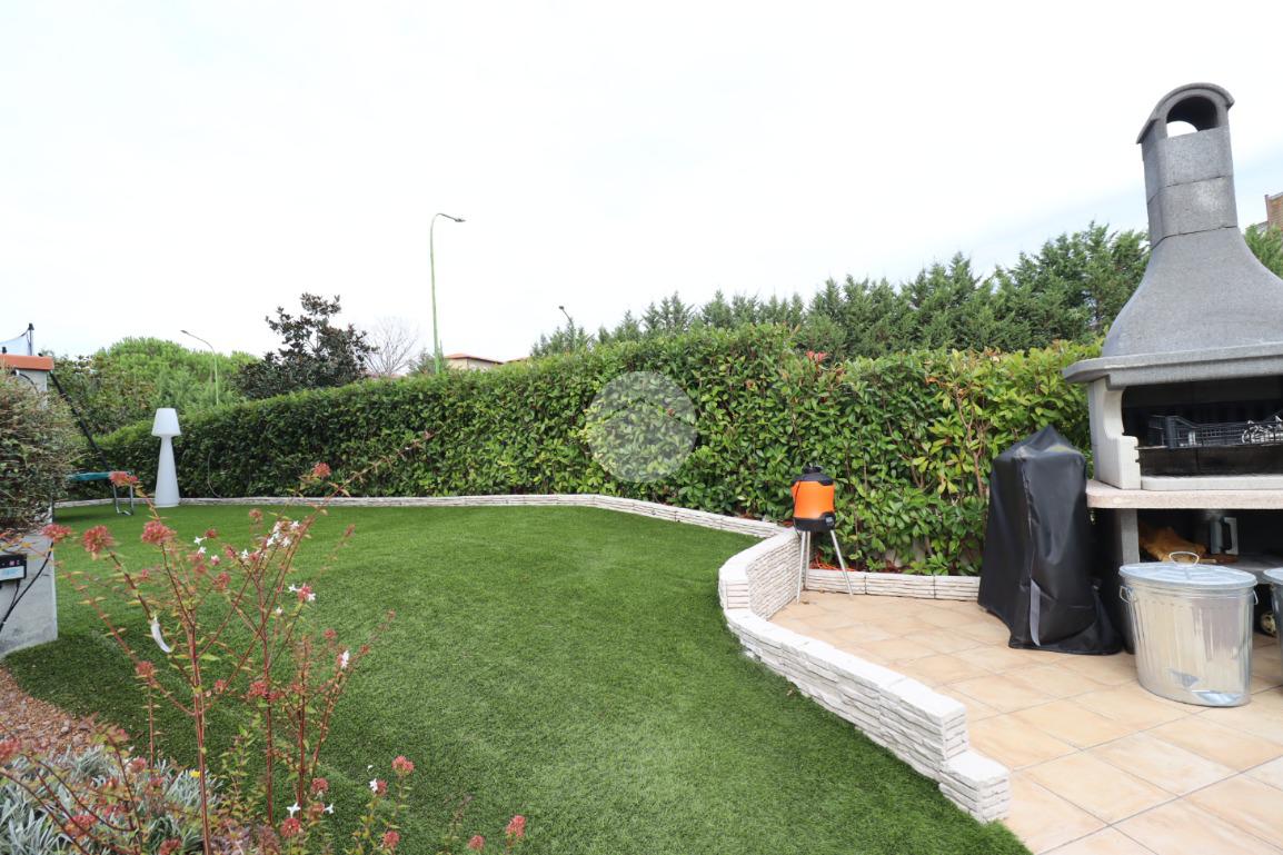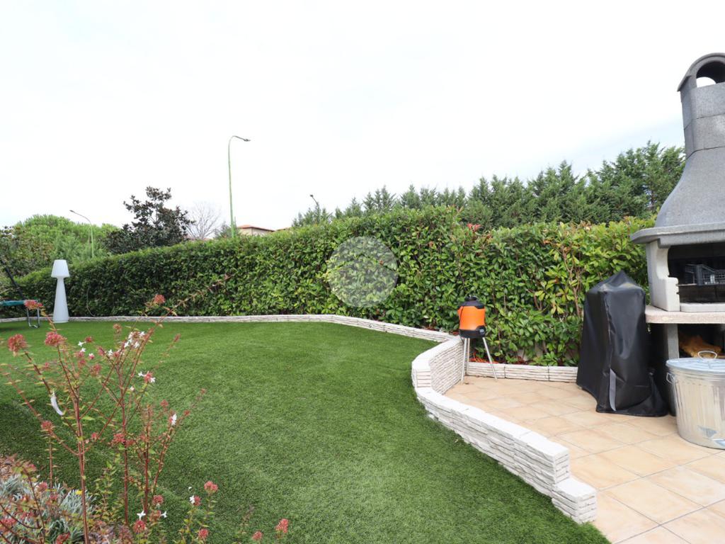 Il giardino è rifinito con erba sintetica di alta qualità, che garantisce un’estetica ordinata con minime esigenze di manutenzione. Un curato vialetto centrale è incorniciato da siepi sagomate e piante ornamentali selezionate, contribuendo a creare un'atmosfera elegante e armoniosa.