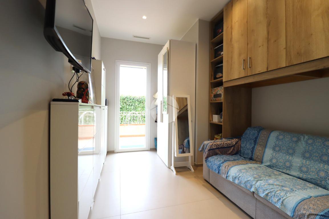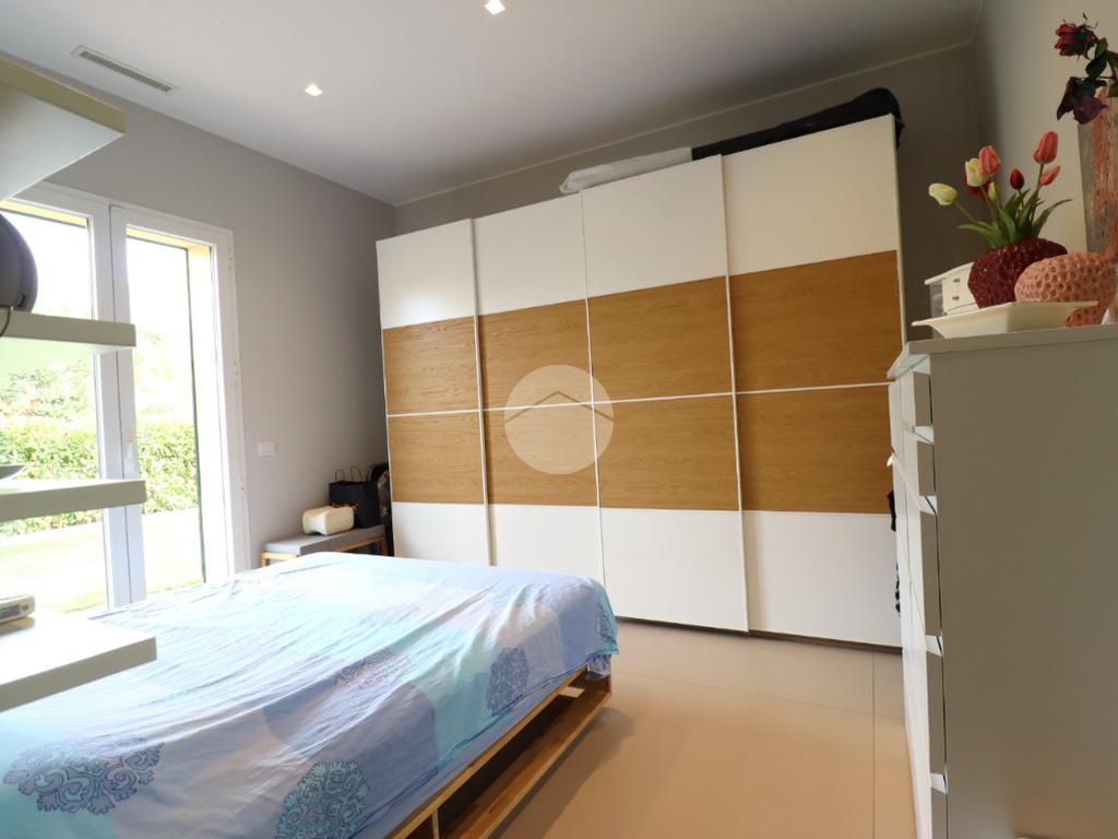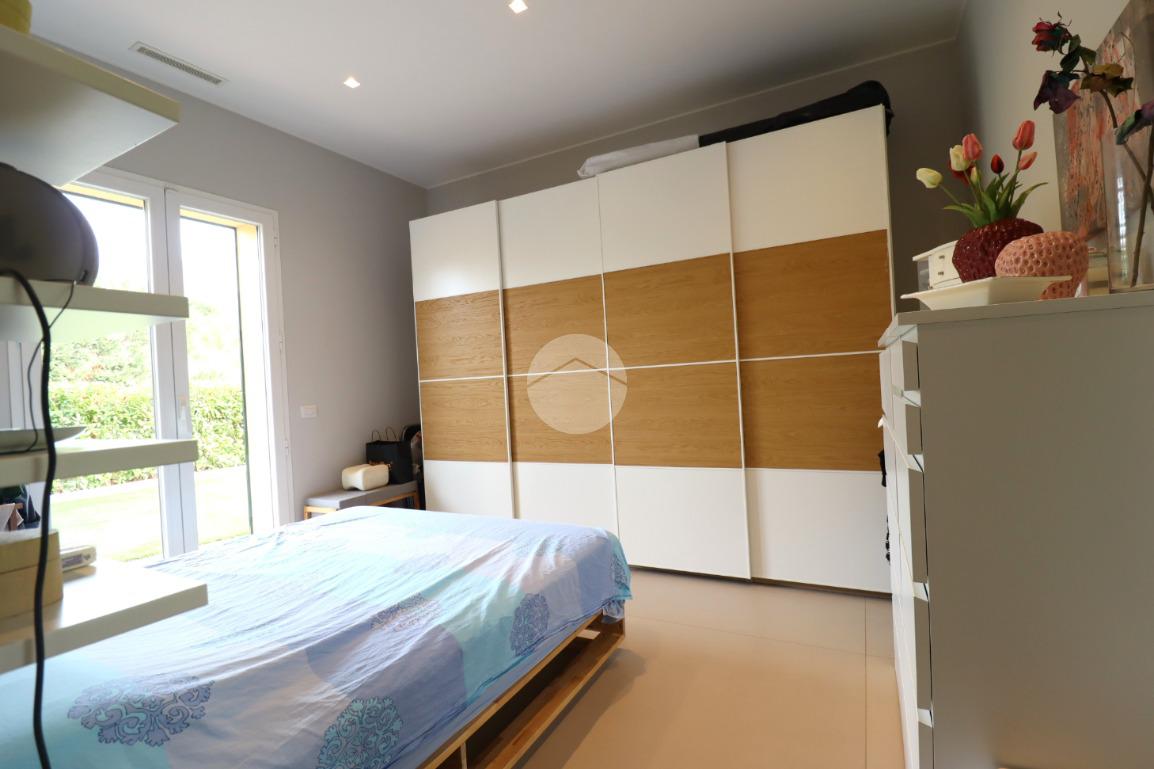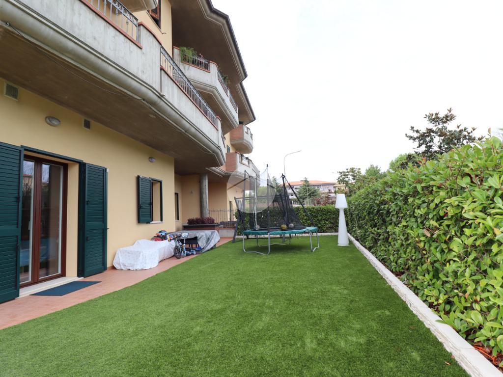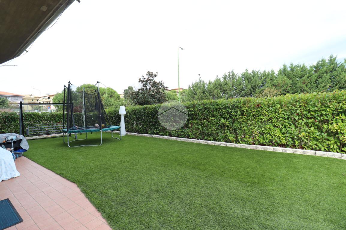 Il giardino è rifinito con erba sintetica di alta qualità, che garantisce un’estetica ordinata con minime esigenze di manutenzione. Un curato vialetto centrale è incorniciato da siepi sagomate e piante ornamentali selezionate, contribuendo a creare un'atmosfera elegante e armoniosa.